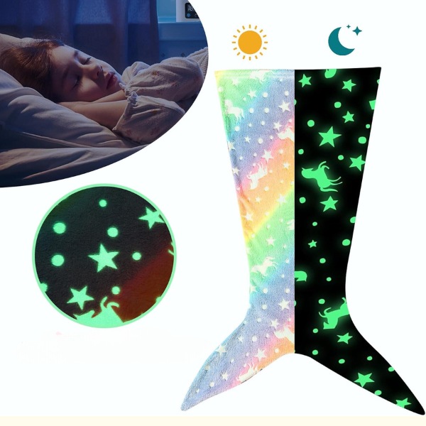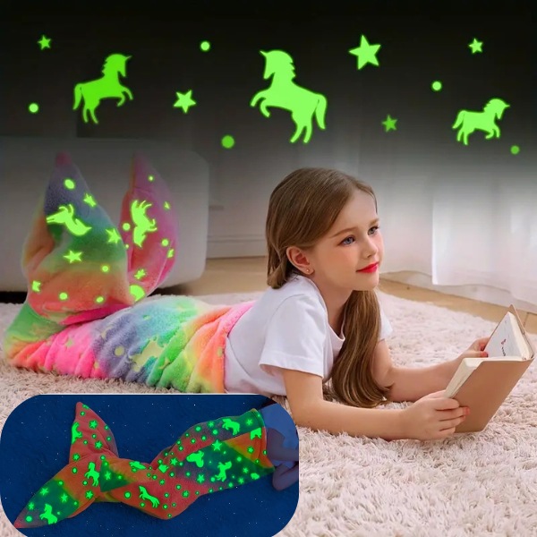 Pokrivač MERMAIDREAM svijetli u mraku, pružajući umirujuće svjetlo koje ublažava noćne strahove. Jednostavno ga izložite dnevnom svjetlu 20 minuta i nježno će svijetliti cijelu noć. Odaberite dizajn repa morskog psa ili repa sirene za dodatnu magiju dok vaše dijete spava.