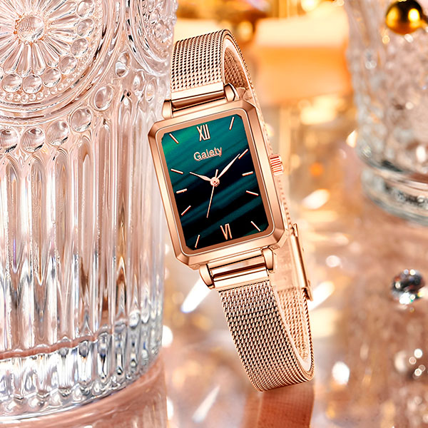 Ovaj sat ima sjajnu ružičasto-zlatnu boju i prekrasan zeleni brojčanik. Dodaje stil svakoj haljini, trapericama ili svečanoj odjeći.